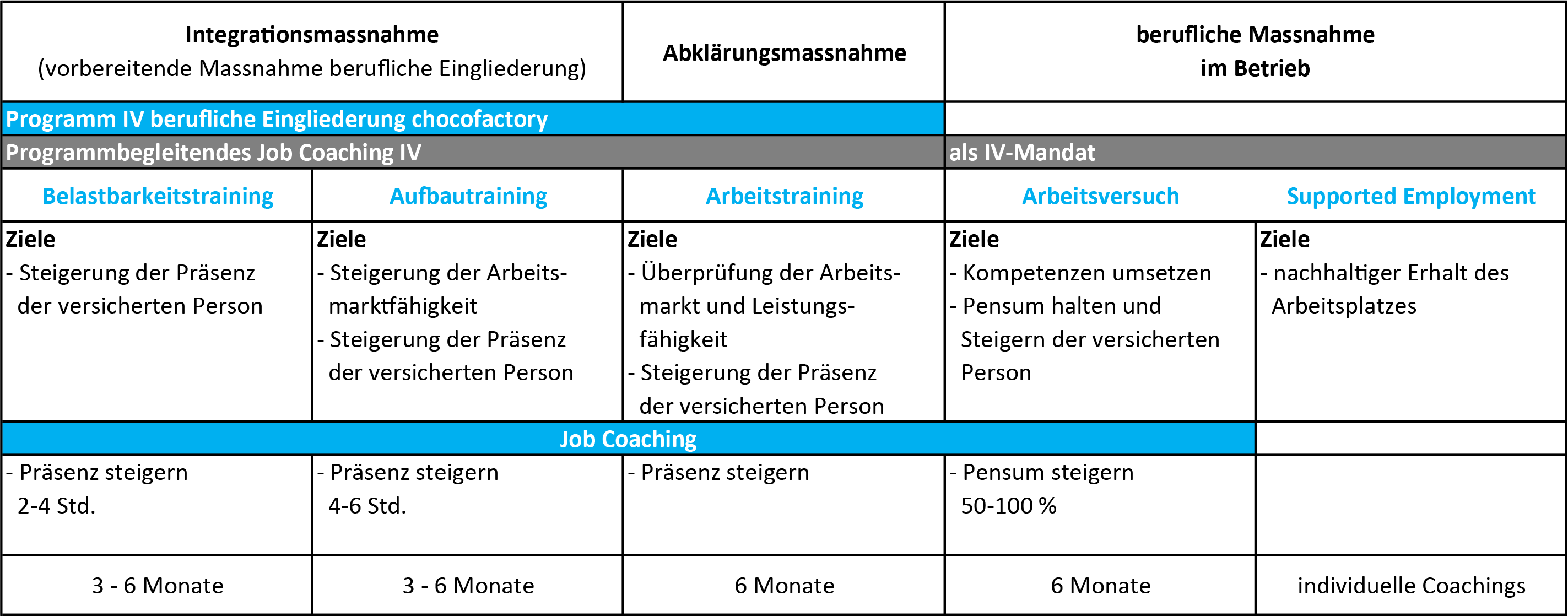 Durch wirtschaftsnahe Integration und Support am Arbeitsplatz wird der Einstieg der versicherten Person in den ersten Arbeitsmarkt und die nachhaltige Sicherung des Arbeitsverhältnisses angestrebt. Das Ziel ist der Erhalt der Stelle im 1. Arbeitsmarkt auf Dauer und zu einem leistungsgerechten Lohn.